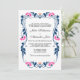 © Socialite Designs. Una elegante hoja, flores y remolinos bordean con hermosos azules y rosados de color azul marino y un toque de combinación de colores naranjas. El diseño es perfecto para cualquier celebración o reunión.