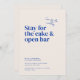 La tarjeta de diseño de Belmont muestra una tipografía grande que dice "Ven por el boda. Quédate con el pastel y el bar abierto". A medida que echan un vistazo a continuación, los detalles esenciales de la celebración se presentan con elegancia en un pequeño y clásico tipo de letra serif. En la parte trasera hay un lienzo para otra hermosa foto de la pareja, que permite echar un vistazo a su viaje compartido. Un mensaje personalizado, cuidadosamente diseñado por la pareja, agrega un toque cálido e íntimo, invitando a los seres queridos a unirse a la celebración de su unión.