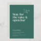 La tarjeta de diseño de Belmont muestra una tipografía grande que dice "Ven por el boda. Quédate con el pastel y el bar abierto". A medida que echan un vistazo a continuación, los detalles esenciales de la celebración se presentan con elegancia en un pequeño y clásico tipo de letra serif. En la parte trasera hay un lienzo para otra hermosa foto de la pareja, que permite echar un vistazo a su viaje compartido. Un mensaje personalizado, cuidadosamente diseñado por la pareja, agrega un toque cálido e íntimo, invitando a los seres queridos a unirse a la celebración de su unión.