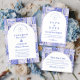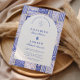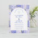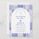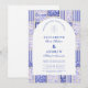 Un diseño atemporal en azul y blanco inspirado en el clásico porcelana Delft y los patrones de toile francés. El borde de baldosas de patchwork combina delicadas flores, rayas y motivos ornamentales que evocan cerámicas europeas vintage. Un suave panel arqueado en el centro mantiene el diseño refinado y elegante, permitiendo que los detalles del patrón inspirado en la porcelana enmarquen la celebración de manera hermosa. Perfecto para parejas que planean una boda sofisticada en azul y blanco con encanto europeo tradicional.