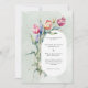 Elevar a su boda con esta invitación a la boda de Tulipanes de color Oblong. Este diseño presenta un marco oblongo fuera del centro rodeado de tulipanes acuarelas con un fondo de color verde. La parte posterior incluye un código QR opcional para mayor comodidad.