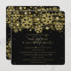 Plantilla de "invitación de boda de vacaciones dorada y negra Guardar la fecha" moderna y elegante, con copos de nieve y luces con brillo dorado sobre fondo negro.