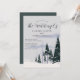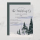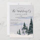 Una hermosa escena invernal de bosques llenos de nieve de abeto verde oscuro y abetos y un cielo gris pálido decoran esta invitación a la boda de vacaciones. Este moderno dibujo de un paisaje natural nevado es perfecto para una boda de diciembre o enero por la noche.