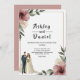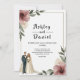 Esta elegante invitación a una boda floral acuática es perfecta para un boda moderno. El diseño romántico presenta un marco floral de color agua elegante con un ilustracion de novia y novio y una caligrafía negra con un fondo blanco.