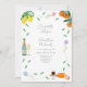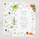 Hermosa invitación de boda moderna y colorida en acuarela con sencillos elementos botánicos boho, tema de cítricos naranja y limón ideal para una boda soleada de verano. La obra original del artista Catherine Sweetman incluye follaje, flores silvestres, queso y vino, notas musicales y copas de burbujeante. Caligrafía caprichosa y tipografía moderna con plantillas fáciles de personalizar para agregar nombres, la fecha y otra información esencial junto con las iniciales de la novia y el novio en la etiqueta de la ilustración de la botella de vino burbujeante. La paleta de colores incluye limón, amarillo, naranja, verde, azul, púrpura y rosa.