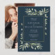 Con delicadas hojas de acuarela en un elegante fondo azul marino. Esta elegante invitación de boda botánica se puede personalizar con su foto y los detalles especiales del día de su boda en tipografía moderna. Diseñado por Thisisnotme©