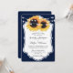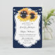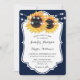 Invitación de boda floral azul marino inspirada en flores de girasol.