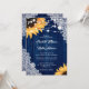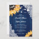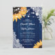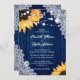 Esta elegante y romántica invitación a una boda floral con girasoles en un marco de madera de granero y encaje es perfecta para invitar a sus invitados a su fiesta de bodas rústica de color azul marino, patio trasero y granero inspirada en los girasoles.