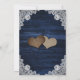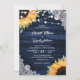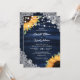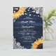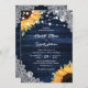 Invitaciones rústicas de boda florales de color azul marino con girasoles sobre un fondo rústico de madera decorado con encaje floral blanco.
