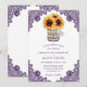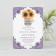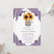 Invitación a una boda rústica con morado y girasol con un girasol y un ramo de aliento para bebés dentro de un frasco de albañilería en un fondo blanco y claro adornado con un encaje floral violeta. Diseño perfecto para invitar a sus invitados a su fiesta de bodas rústico morado inspirado en los girasoles.