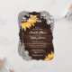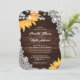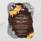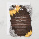 Esta rústica invitación a celebrar bodas de girasoles con girasoles y encaje rústico sobre un fondo de madera de granero es perfecta para invitar a sus invitados a su rústica fiesta de bodas inspirada en las flores de girasol.