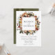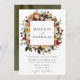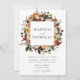 Elegantes invitaciones de bodas de otoño con nombres en el interior de un marco cuadrado rodeado de flores acuarelas y vegetación con colores otoñales mudos de marfil, naranja, oro de mostaza, verde oliva, rosa polvoriento y marrón. Las invitaciones de casamiento floral de otoño se invitan a revertir para mostrar un rico fondo de color verde oliva. Diseñado para coordinar con nuestra colección Boho Autumn Floral boda.