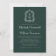Este elegante diseño de invitación a la boda de inspiración vintage presenta un par de iniciales en monograma blanco con una fuente serif abierta por encima y por debajo de una línea divisoria y rodeado por una línea de arte acanthus escudo sobre un fondo verde oscuro del bosque. La parte trasera de la tarjeta es verde de bosque sólido.