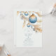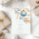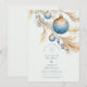 Un diseño minimalista y elegante con Navidades azules esmerilados colgando de ramas de pino dorado. La paleta vintage de invierno y los suaves detalles acuáticos crean un ambiente boda de vacaciones refinado y romántico con un toque de boho.