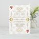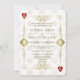 Diseño de tarjeta único con tema de Casino Royale y Great Gatsby. Cuenta con estilo art déco vintage, un marco antiguo de Hollywood de la década de 1920 con Fleur-de-lis dorado falso, corazones rojos, Q y K en dos esquinas (simulando cartas de juego), sobre un fondo dorado blanco con patrón Art Déco. Se utilizan palabras especiales como en un juego de póquer. En la parte posterior, patrón Art Déco dorado falso e iniciales entre palos de cartas de juego. Utilice la herramienta Personalizar para agregar su información. Para más información, visite mi Colección Gatsby Casino.