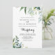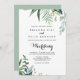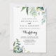 Esta elegante y frondosa invitación tropical a la boda es perfecta para un boda moderno. El diseño está decorado con hojas tropicales verdes. Guarde el papel incluyendo más detalles en la parte posterior de la invitación en lugar de en una tarjeta separada.