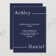 Esta elegante invitación a la boda azul marino es perfecta para un boda moderno. el diseño es sencillo, con una elegante caligrafía blanca sobre un fondo azul.