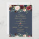¿Te vas a casar pronto y necesitas enviar invitaciones por correo? Tenemos la respuesta aquí: ¿Por qué no les envías y les dices que te vas a casar con esta hermosa, chic y elegante Invitación de Boda con arreglo floral de bouquet boho de acuarela floral personalizada en azul marino, borgoña y dorado? La invitación presenta flores vibrantes de acuarela con un marco de efecto de lámina dorada falsa y un arreglo de bouquet con fondo azul marino. Esta invitación chic y elegante se personaliza fácilmente con tu texto o puedes reemplazar el color de fondo del anverso y reverso. Así que puedes personalizar y adaptar esta invitación a tu gusto.