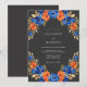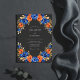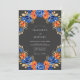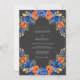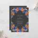 Este diseño dramático presenta un contraste impactante entre un fondo profundo de carbón y vibrantes ilustraciones botánicas. Rosas de azul real saturado y amapolas de naranja quemada crean una estética de alta energía perfecta para una ceremonia audaz por la noche. Un exuberante follaje dorado se entrelaza a través del arreglo floral, añadiendo un toque de calidez opulenta a la paleta de colores sombríos.