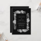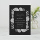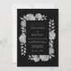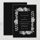 Este diseño presenta una estética monocroma llamativa con delicadas rosas blancas y follaje botánico sobre un fondo negro profundo. La paleta de alto contraste crea un ambiente sofisticado ideal para eventos formales de noche. Hojas elegantes y pétalos suaves aportan un toque romántico al telón de fondo oscuro y dramático.