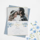 Boho, moderna y elegante invitación a una boda azul polvorienta de flores silvestres con escritura moderna de caligrafía, corazón de cuerda dorada y foto.
