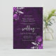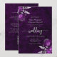 Esta elegante invitación de boda presenta ramos florales de ciruela realzados con follaje de papel de aluminio plateado en dos esquinas, sobre una imagen de fondo de ágata de acuarela púrpura ciruela. El reverso proporciona espacio para los detalles de la boda, junto con un código QR que los invitados pueden escanear para visitar su sitio web y responder, lo que ahorra el costo de imprimir y enviar por correo tarjetas de respuesta separadas.
