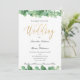 Una hermosa invitación de boda con eucalipto verde y dorado con caligrafía dorada.