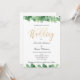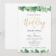 Una hermosa invitación de boda con eucalipto verde y dorado con caligrafía dorada.