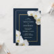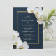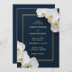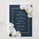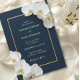 Invite a sus seres queridos a celebrar su matrimonio con esta elegante y moderna invitación personalizada a la boda. Delicadas orquídeas blancas floración que acentúan sus nombres, en un sofisticado marco marino enmarcado por un sutil borde dorado. Personalizar con todos los detalles esenciales de su boda para una invitación eterna.