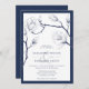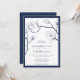 Invitación de boda blanca y marina moderna y elegante. Diseño con fondo marino profundo, elementos florales en tonos azul marino y detalles bodas dentro del marco blanco. Agregue los detalles del evento utilizando los campos de plantilla proporcionados y, a continuación, haga clic en "personalizar" para editar esta plantilla.