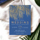 Moderna y sencilla acuarela de palmera dorada con una tipografía simple, un tema de moda y boda tropical sobre la hoja de palmera con el color azul del boda del año.