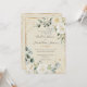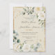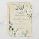 Bonitas y elegantes rosas blancas y diminutas margaritas rodeadas de un marco rústico de oro y vegetación mixta de eucalipto con otras acuarelas que invitan a la boda. Flores de color neutra sobre un fondo crema. Sólo exquisito. El oro falso salpicará delante y atrás para crear un aspecto de moda.