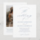 Una invitación de boda fotográfica simple y chic que presenta detalles de caligrafía de escritura elegante y texto clásico superpuesto en una foto vertical de retrato en la parte frontal. La parte trasera tiene una foto y un código QR de respuesta de boda con sitio web. Haga clic en el botón de edición para personalizar este diseño.