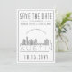Una invitación única de "save the date" para una boda que tendrá lugar en la hermosa ciudad de Austin. Esta invitación presenta una ilustración estilizada del horizonte único de la ciudad con su nombre debajo. A esto le sigue la información de su día de boda en un estilo abierto y lineal coincidente. En el reverso de la invitación hay un color gris oscuro para complementar la apariencia y sensación. Todos los elementos individuales de la tarjeta de invitación están desbloqueados, así que siéntase libre de cambiar cualquier detalle necesario, como tamaños de fuente, estilos y más, utilizando la función de personalización. Puede agregar una foto al reverso y aplicarle un filtro en blanco y negro. ¡Diviértase siendo creativo y haciendo que sea suyo!