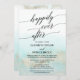 Esta tarjeta de recepción de boda en la playa con acuarela de aqua y oro es perfecta para una fiesta posterior a la boda en un destino tropical. El diseño simple y moderno cuenta con una impresionante acuarela turquesa, azul teal y azul claro con un brillo suave de oro que recuerda la arena y el mar. Está emparejado con una hermosa caligrafía elegante. Las tarjetas de RSVP se venden por separado.