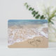 Corazones en la playa en la arena con nombres de novia y novio para RSVP de boda.