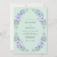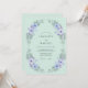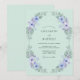 Este diseño presenta un suave fondo verde menta adornado con un delicado arreglo de anémonas lavanda y flores de pervinca. Las hojas de eucalipto de dólar de plata y el follaje aéreo crean una estética natural y etérea perfecta para un evento de primavera o verano. Las texturas de acuarela y la paleta pastel evocan una sensación de romance tranquilo y belleza botánica.