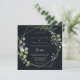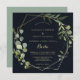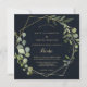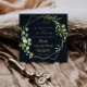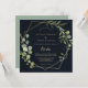 Esta invitación a una boda dorada geométrica azul es perfecta para un simple boda. El diseño está decorado con hermosas hojas verdes pintadas a mano en un fondo azul oscuro, adornando un marco geométrico dorado.