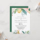 Esta ilustrada invitación a una boda floral tropical española es perfecta para una boda de destino. El diseño está decorado con flores blancas, amarillas, rosadas y onduladas, con hermosas hojas de color verde acuático, que inspiran elegancia.