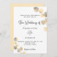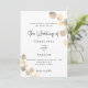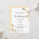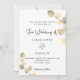 Un fondo blanco decorado con brotes de eucaliptos dorados. Personaliza y tu nombre y detalles de la ceremonia. Letras de color negro. Atrás: fondo dorado