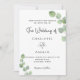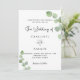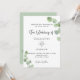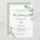 Un fondo blanco decorado con brotes de eucalipto. Personaliza y tu nombre y detalles de la ceremonia. Letras de color negro. Atrás: fondo verde. Agregue su propia URL a su sitio web boda para obtener RSVP en línea o para obtener más detalles.