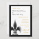 Estas invitaciones a la boda casual de la Fiesta de Lis presentan una sola Fleur de Lis en la esquina inferior izquierda. Presentado aquí en blanco y negro con letras en negro y oro. Rellene la información de su boda utilizando la plantilla, o haga clic en "personalizar" para realizar cambios más extensos en la posición del texto o en la fuente y el color de la fuente.