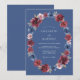 Un romántico wreath ovalado de flores burgundy y azules al estilo pintado adorna este diseño. La rica disposición floral evoca un sentido de encanto clásico y romance sofisticado. Este diseño es perfecto para una ocasión atemporal y elegante.