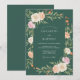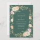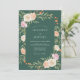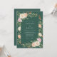 Un rico fondo esmeralda crea un lienzo sofisticado para una delicada artesanía floral. Suaves flores de durazno y rubor se entrelazan con exuberante vegetación, formando un encantador borde. Este diseño evoca un ambiente romántico y elegante para una celebración especial.