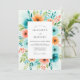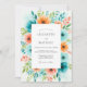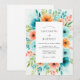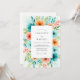 Una disposición floral de acuarela vibrante estalla en tonos de verde azulado, naranja y coral, rodeando un área central para los detalles del evento. Este diseño animado evoca una sensación de romance alegre, perfecto para una celebración de clima cálido.