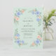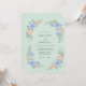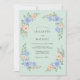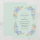 Este diseño muestra un sereno fondo verde menta decorado con delicados arreglos florales de acuarela. Elegantes rosas azules pervinca y suaves flores de melocotón se paren con un exuberante follaje verde para crear una estética fresca y aireada. Esta paleta y estilo son ideales para una ceremonia temática de la naturaleza de temporada.