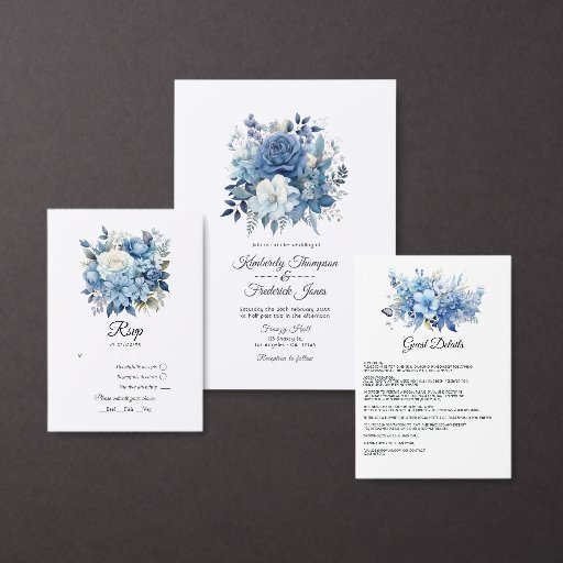 Invitación a la boda con flores de color azul y un elegante personalizable tipográfico a los detalles de tu evento.