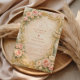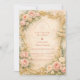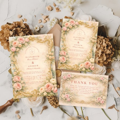 Este diseño de boda lujoso presenta un suave fondo marfil antiguo enmarcado por románticas rosas rosadas, delicada vegetación y ornamentados detalles barrocos en dorado. Inspirada en la elegancia clásica europea, la composición se siente refinada, atemporal y opulenta, con flores fluidas y acentos dorados esculpidos que crean una atmósfera elegante y romántica. Perfecto para parejas atraídas por el encanto vintage, el lujo de otro mundo y una estética de boda elevada y elegante.