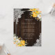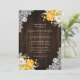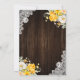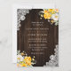 Invitación a una boda rústica y florida, con un ramo de flores amarillas, melocotones y blancas y un verde entorno de madera de granero adornado con un encaje floral blanco. Diseño perfecto para invitar a sus invitados a su fiesta de bodas rústica amarilla.
