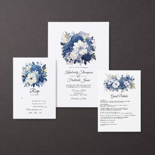 Invitación a bodas florales en blanco y azul marino con acentos de personalizable dorado a los detalles de tu evento.